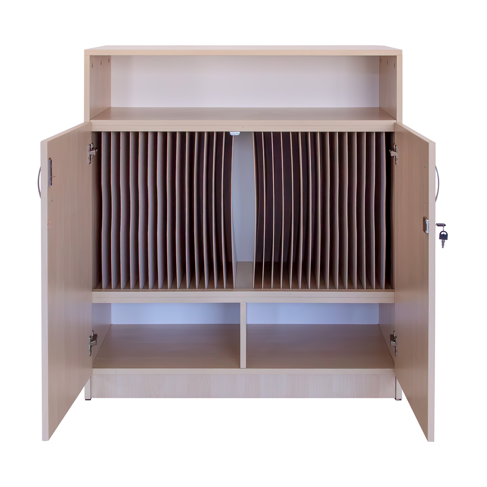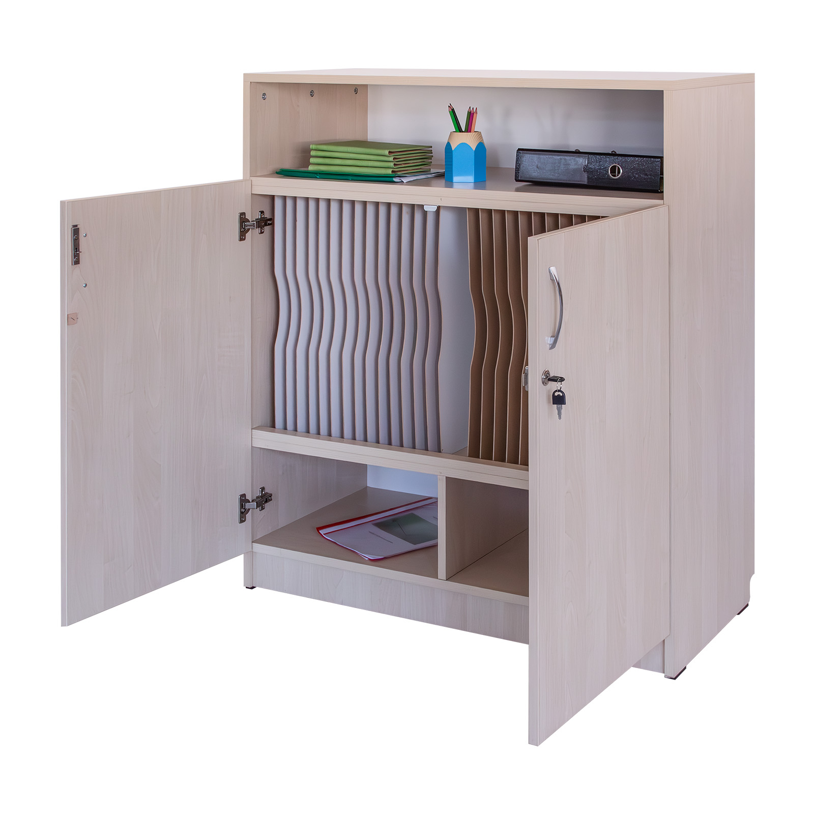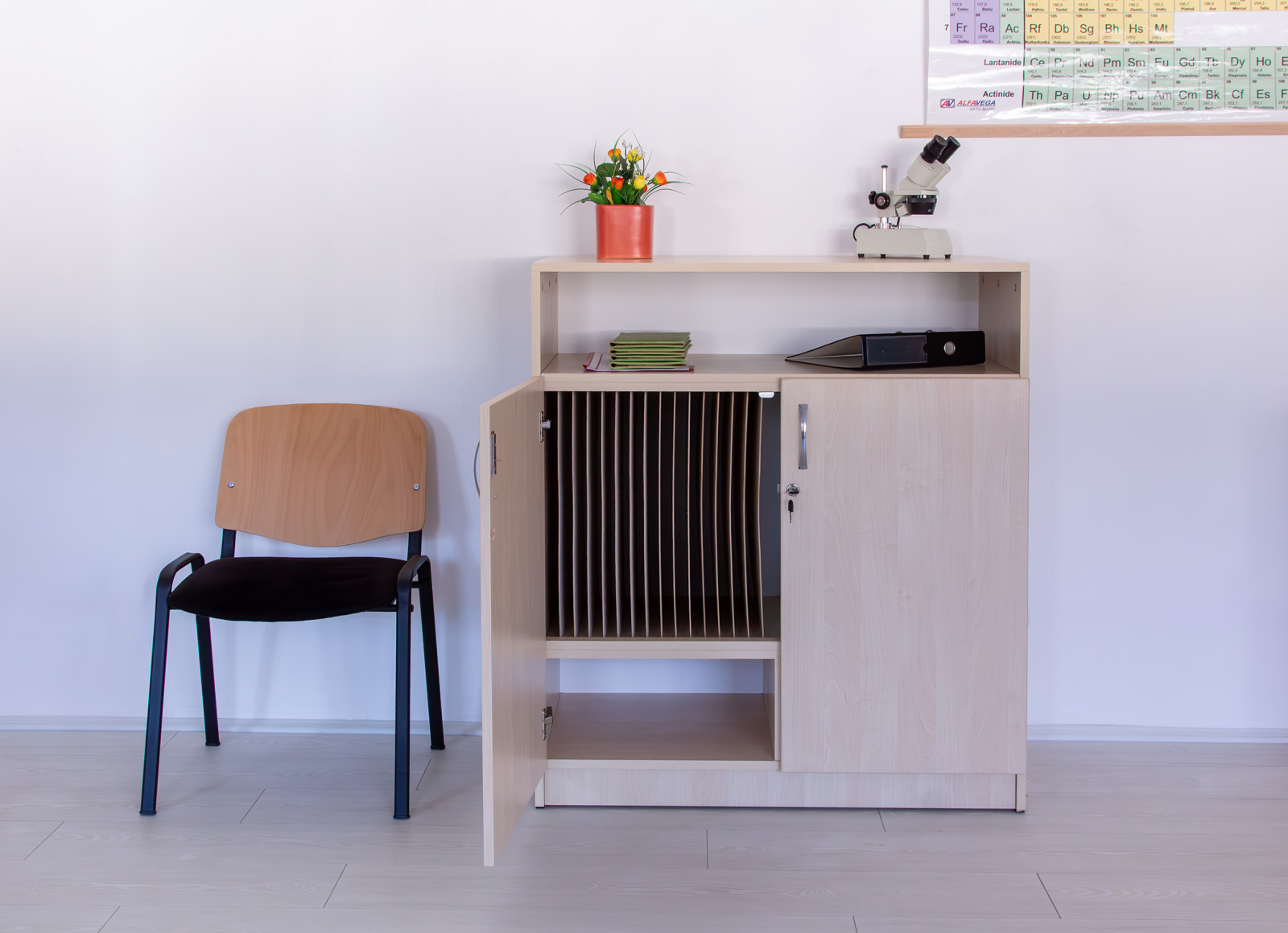 - Realizat din PAL melaminat de 18 mm, cantuit cu cant ABS. Are 2 uși de PAL care se închid cu yala si pereți despărțitori verticali care crează compartimente pentru 28 cataloage.