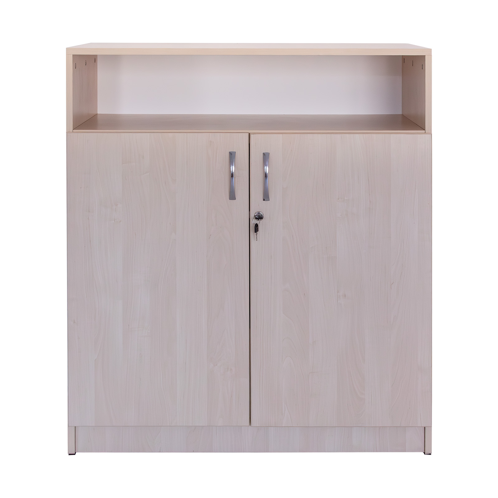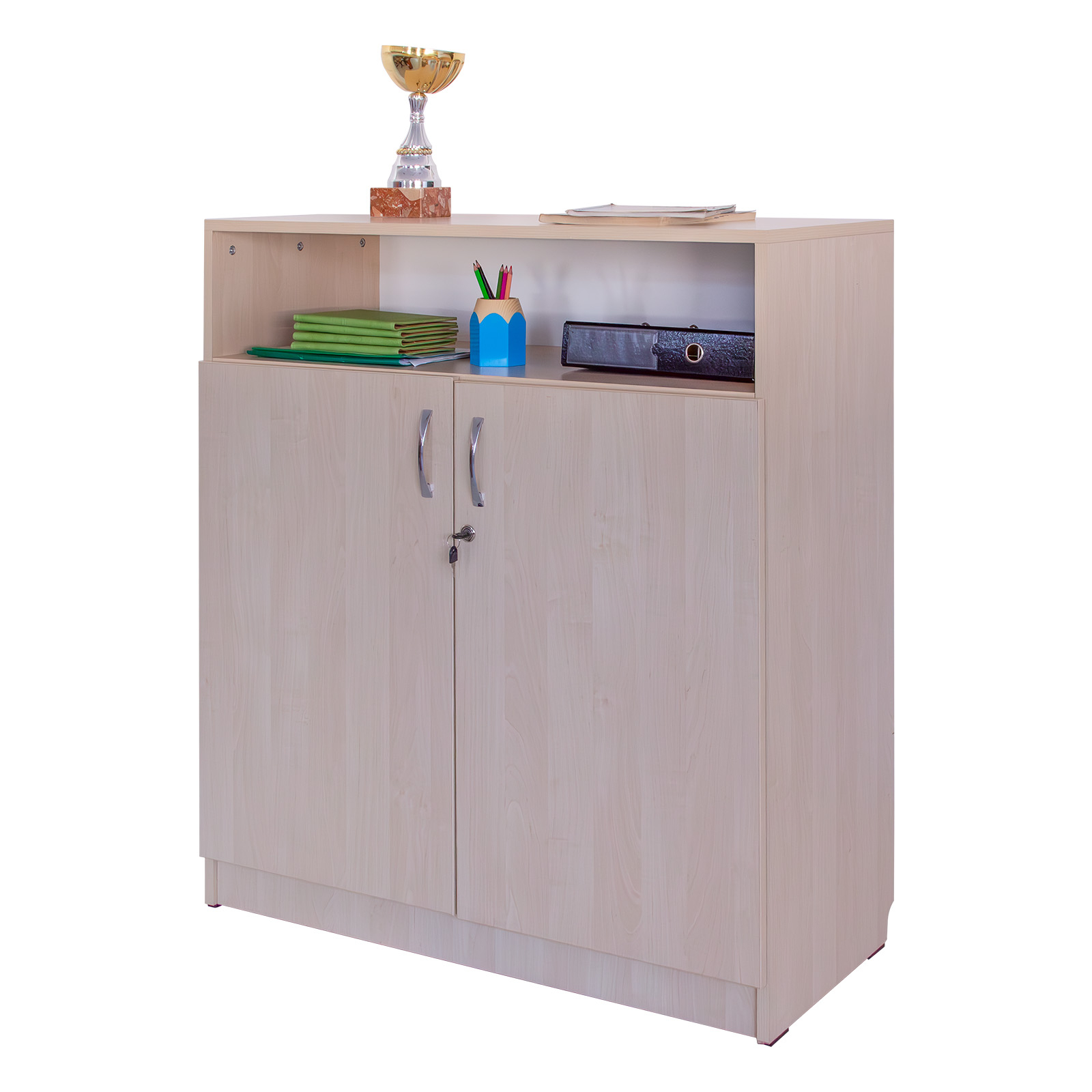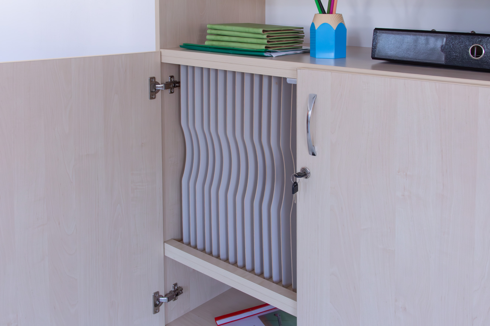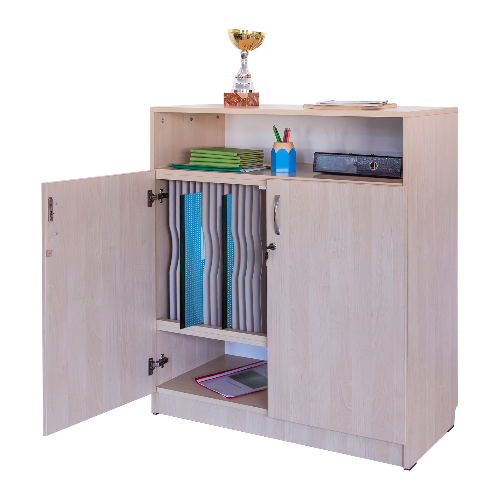 - Realizat din PAL melaminat de 18 mm, cantuit cu cant ABS. Are 2 uși de PAL care se închid cu yala si pereți despărțitori verticali care crează compartimente pentru 28 cataloage.