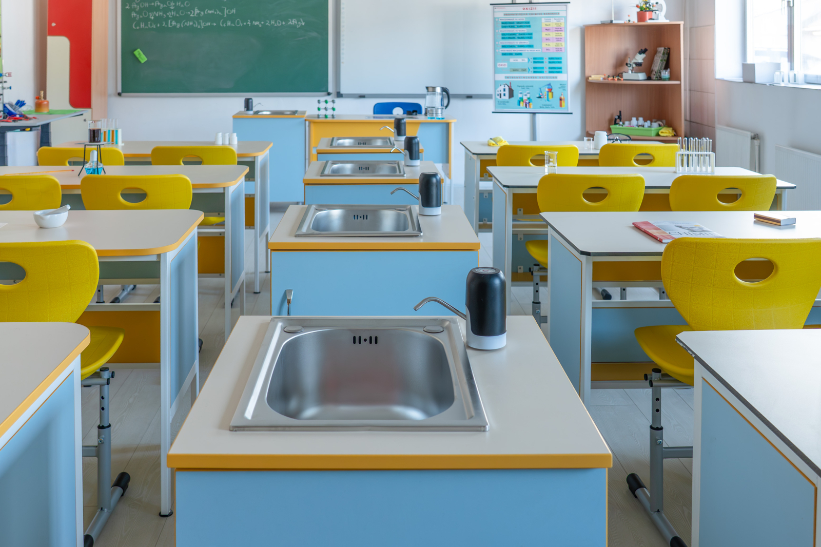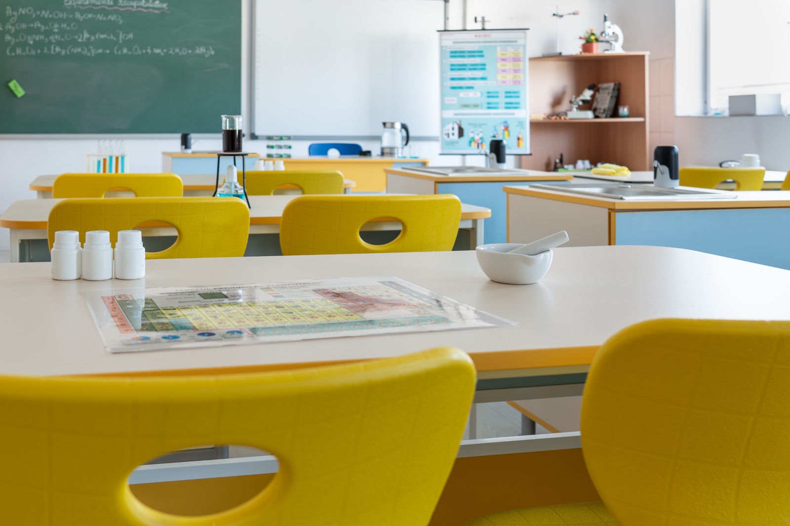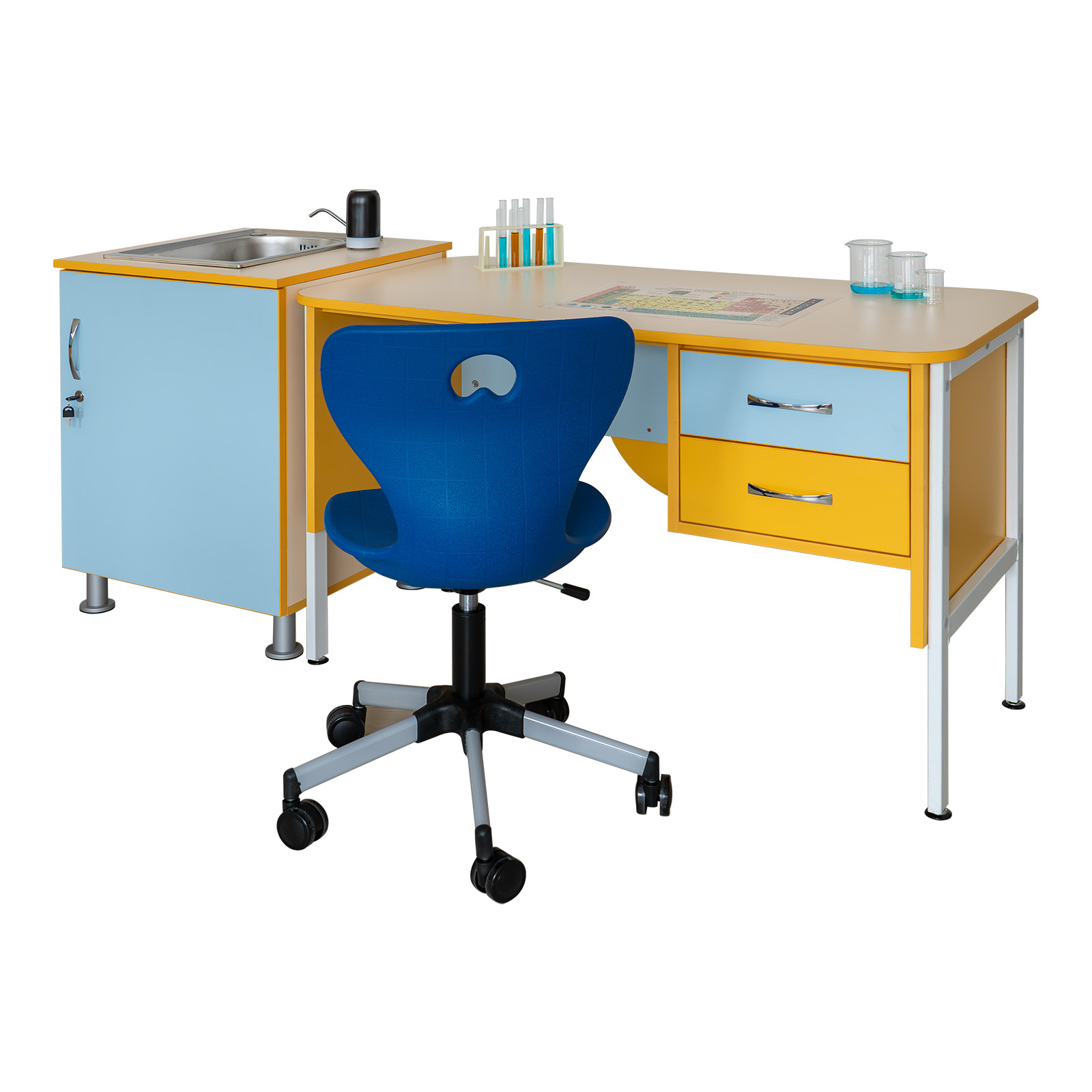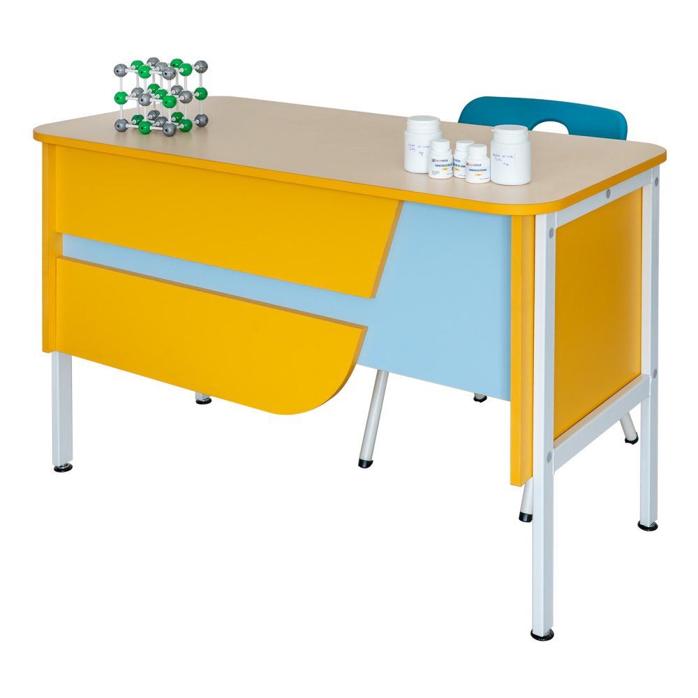 Catedră ACCES – catedră modernă pentru clasă/laborator, cu blat din PAL melaminat, structură stabilă și 2 sertare pentru depozitare. Design color, ușor de integrat în mobilierul școlar.