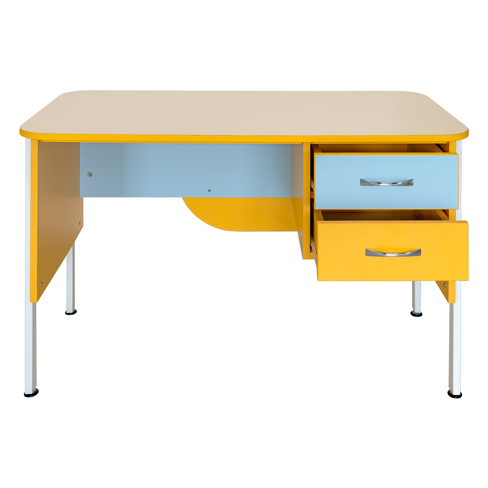 Catedra este prevăzută cu două sertare spațioase, ideale pentru depozitarea documentelor, rechizitelor sau materialelor necesare la oră. Finisajul color și forma modernă completează aspectul general al sălii de clasă sau al laboratorului, păstrând un stil unitar cu gama ACCES.