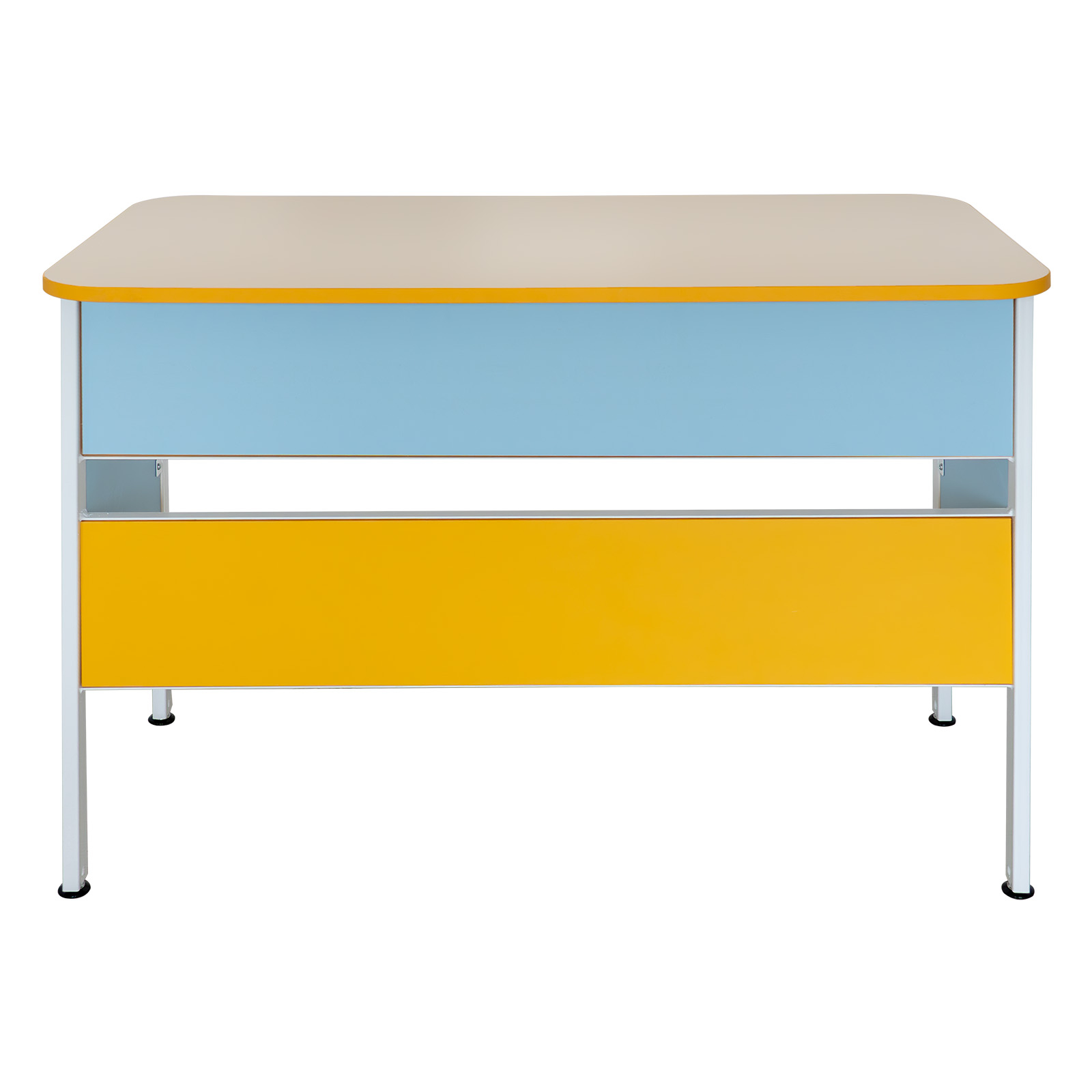Panourile decorative frontale și laterale sunt realizate din PAL melaminat cu finisaj color, contribuind la un aspect plăcut și bine organizat al laboratorului. Pentru un plus de stabilitate, masa este prevăzută cu picioare reglabile și tălpi antiderapante, astfel încât rămâne fermă chiar și în timpul activităților dinamice.