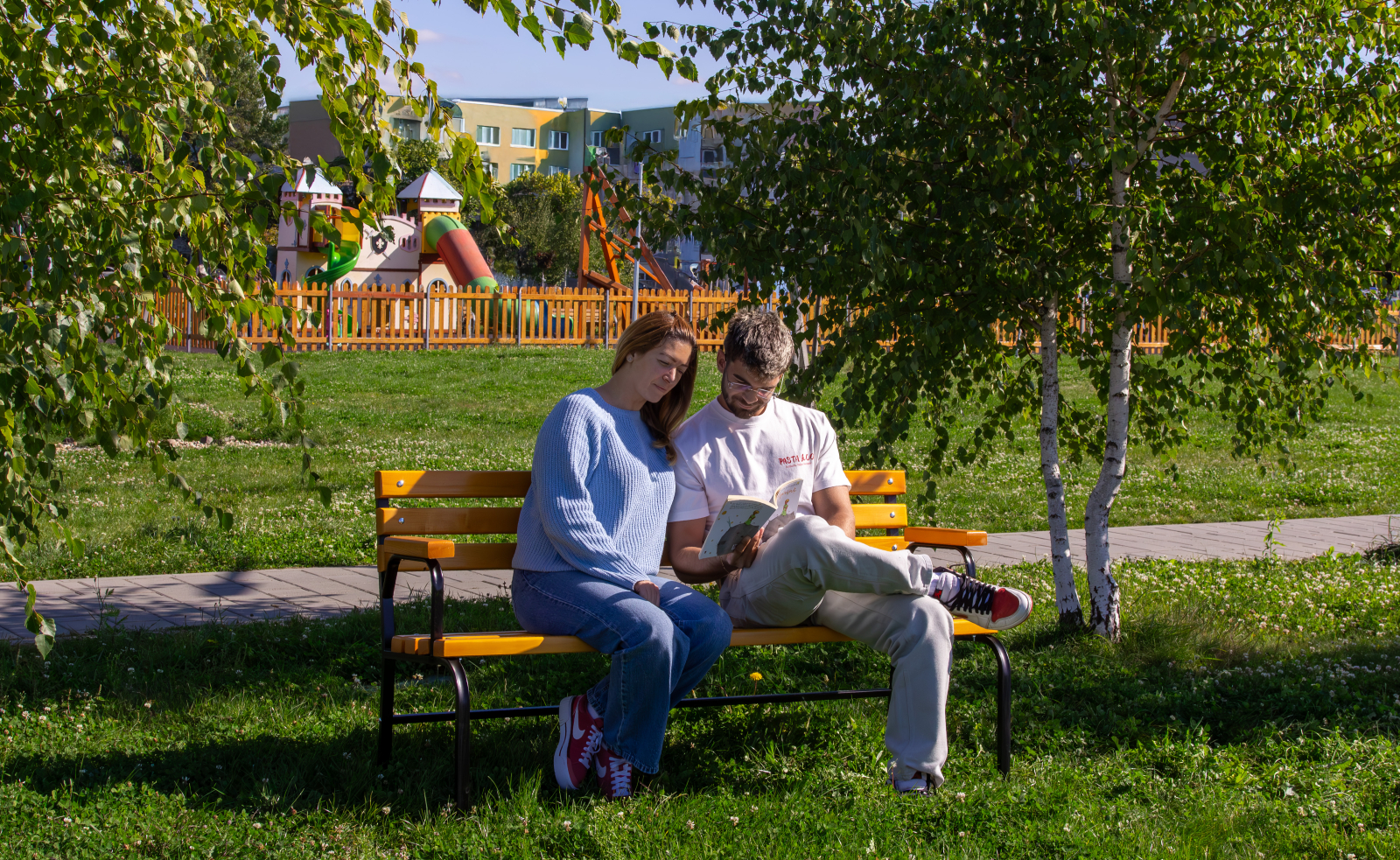 șipci din lemn masiv, finisate pentru a evidenția textura naturală și pentru a asigura rezistență în timp. Structura metalică, cu forme ușor curbate și rigidizare inferioară, este