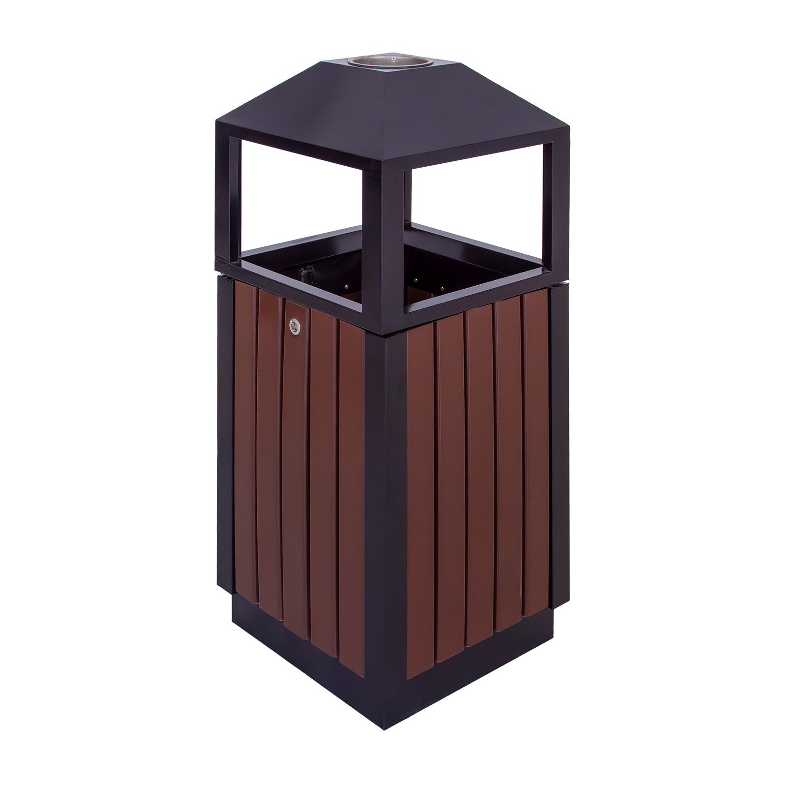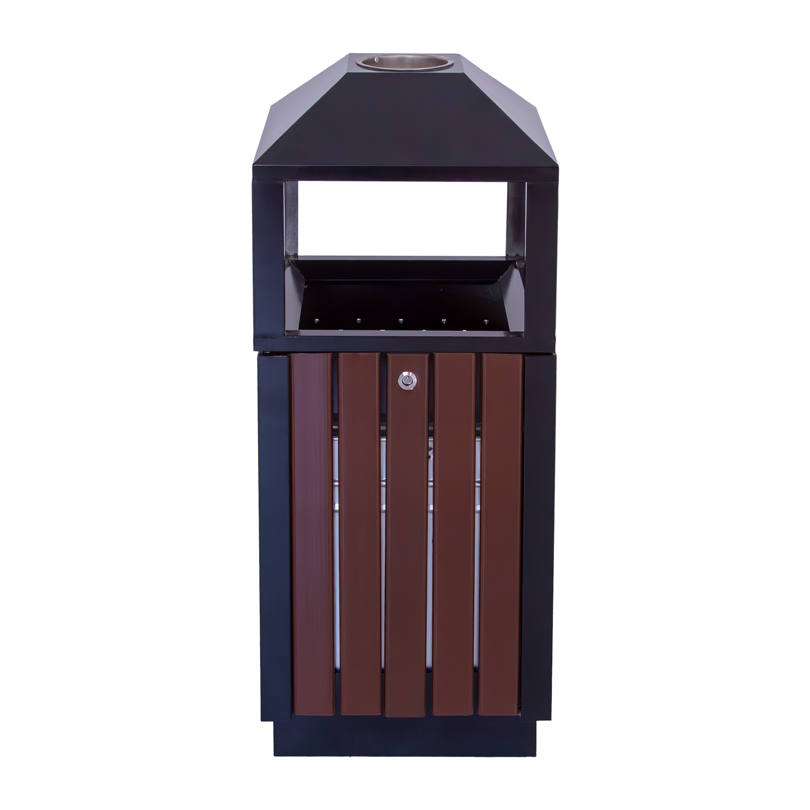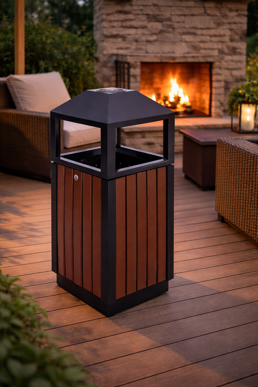 Coșul este prevăzut cu recipient interior metalic detașabil, facilitând golirea rapidă și igienică. Capacul superior protejează conținutul de intemperii și contribuie la menținerea unui aspect ordonat al spațiului.