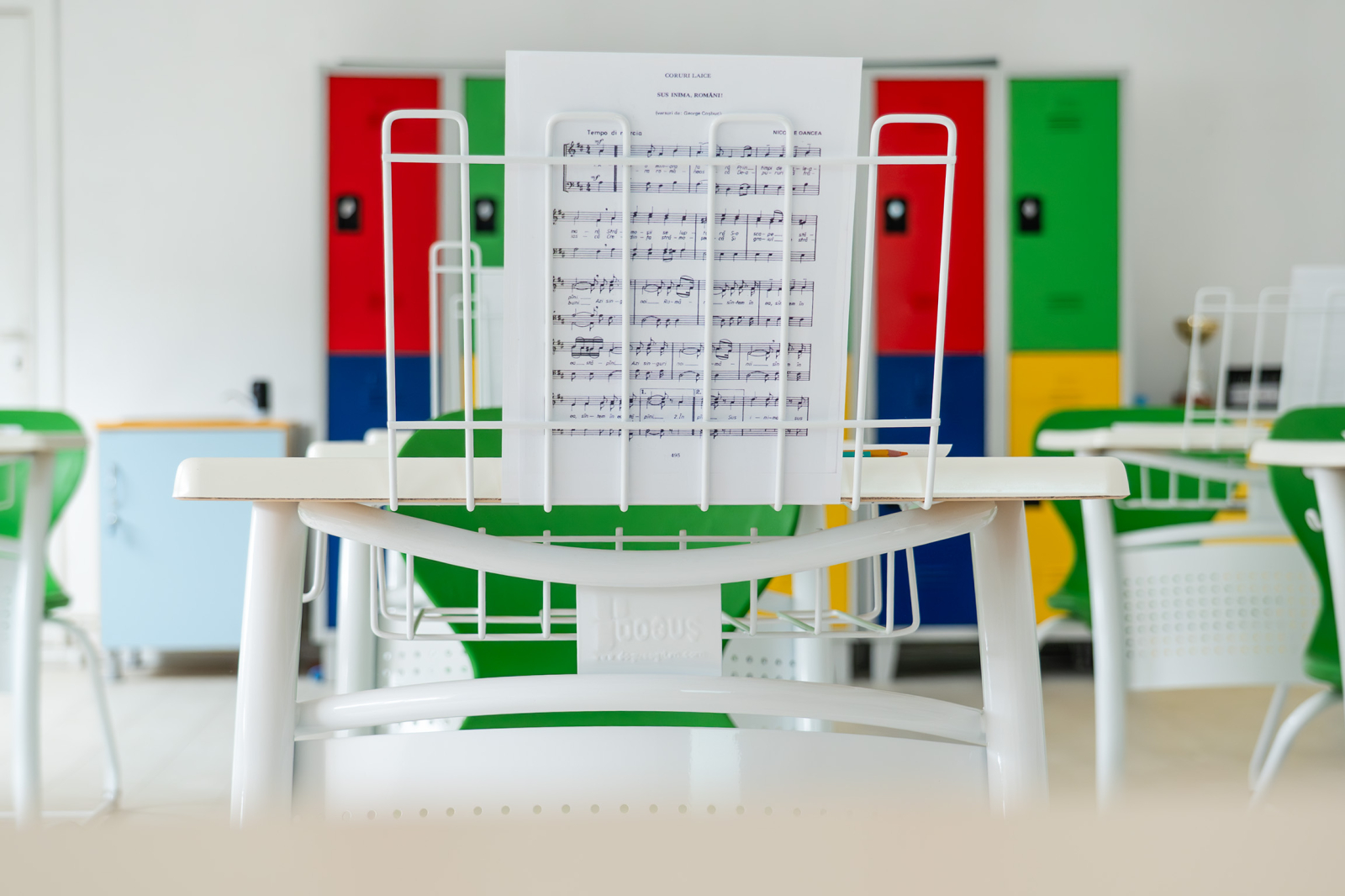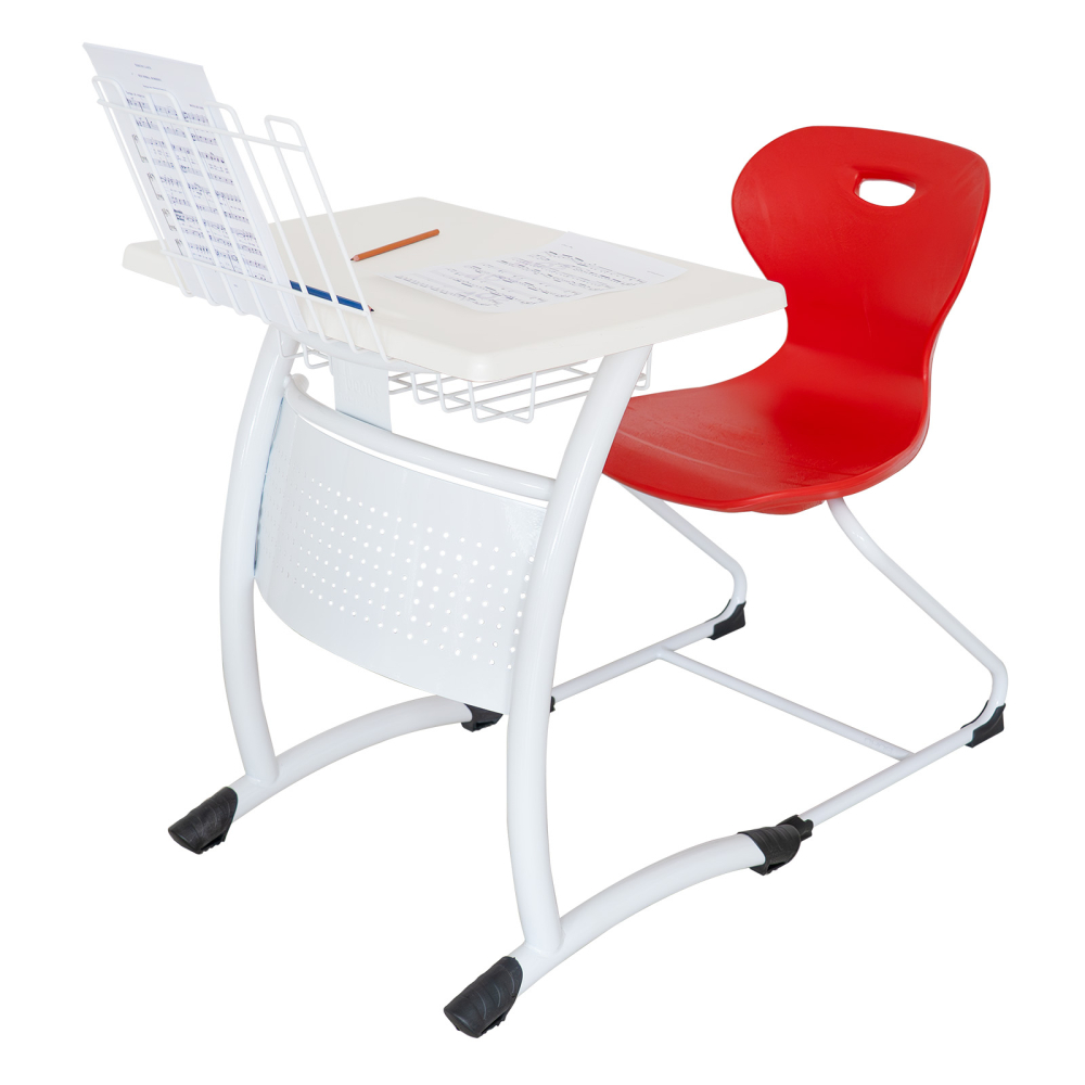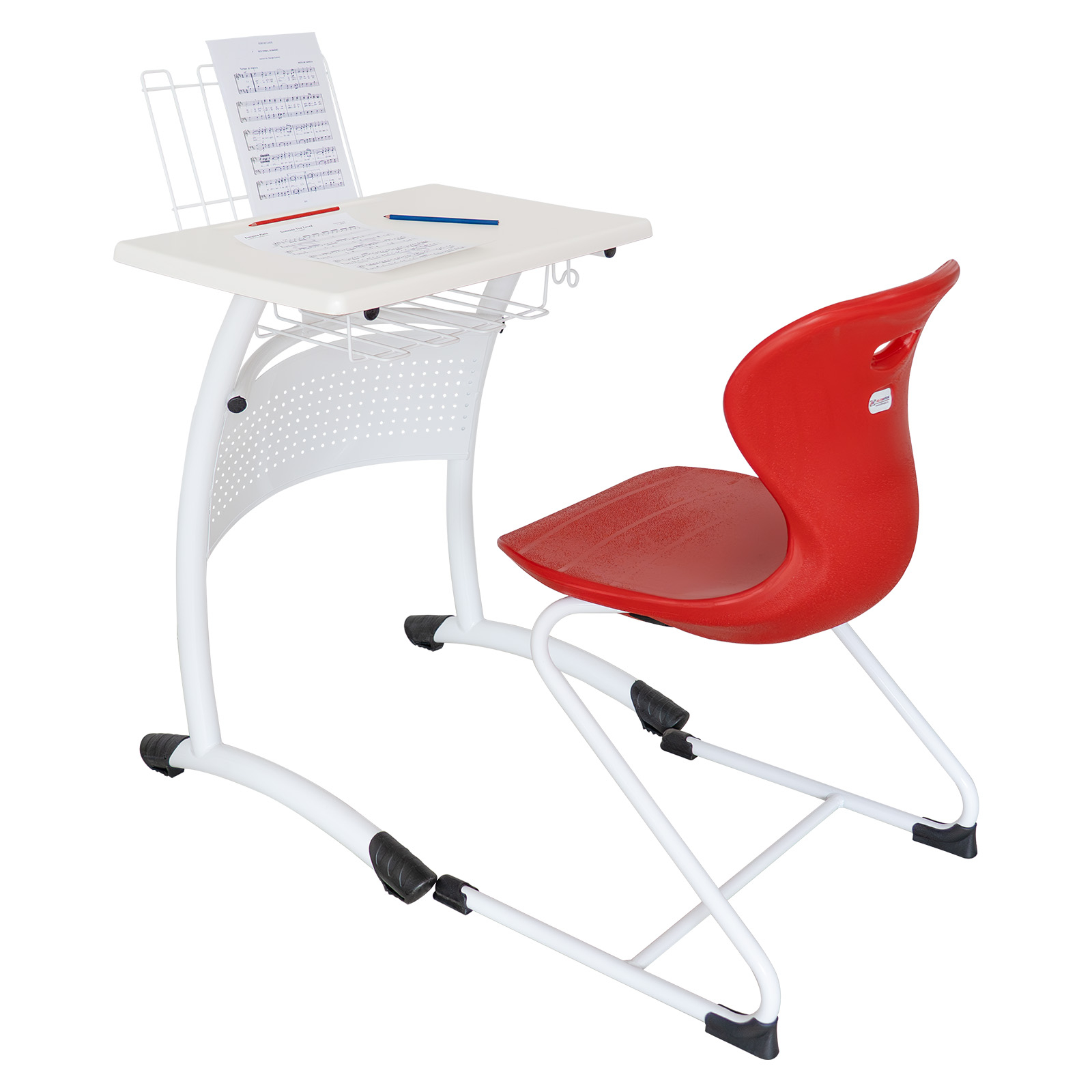 - Prevăzut cu suport pentru cărți robust, în structură complet sudată, poziționat sub blat, vopsit în câmp electrostatic și suport de partitură care oferă o platformă stabilă și ajustabilă, permițând poziționarea comodă a partiturilor pentru o experiență optimă în timpul studiului muzical