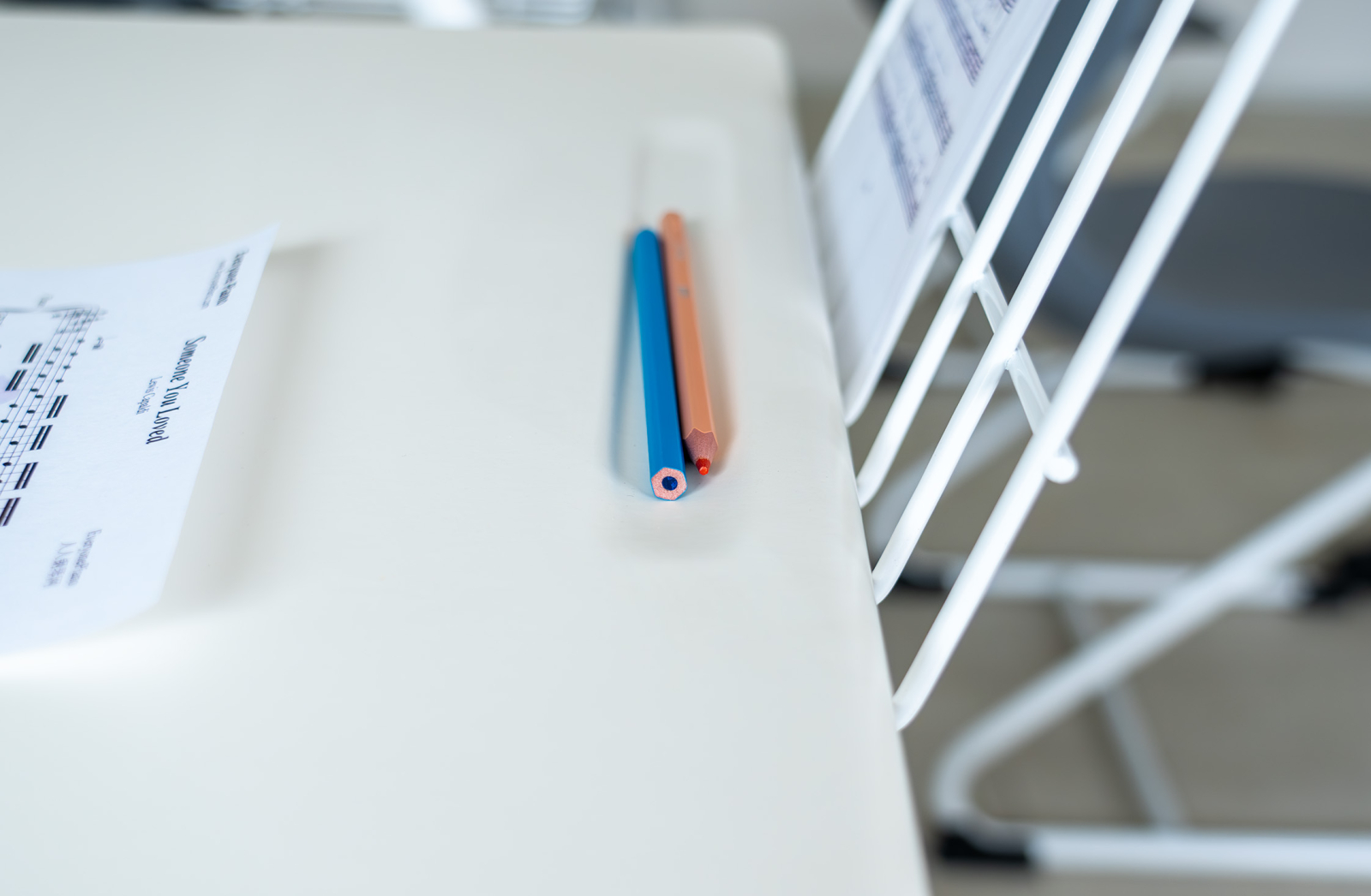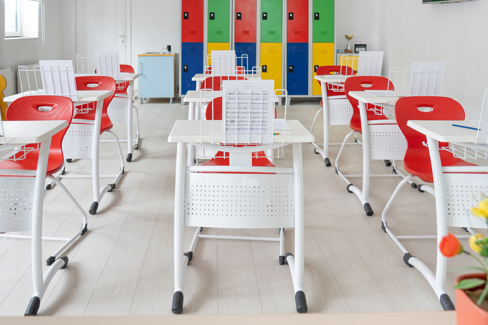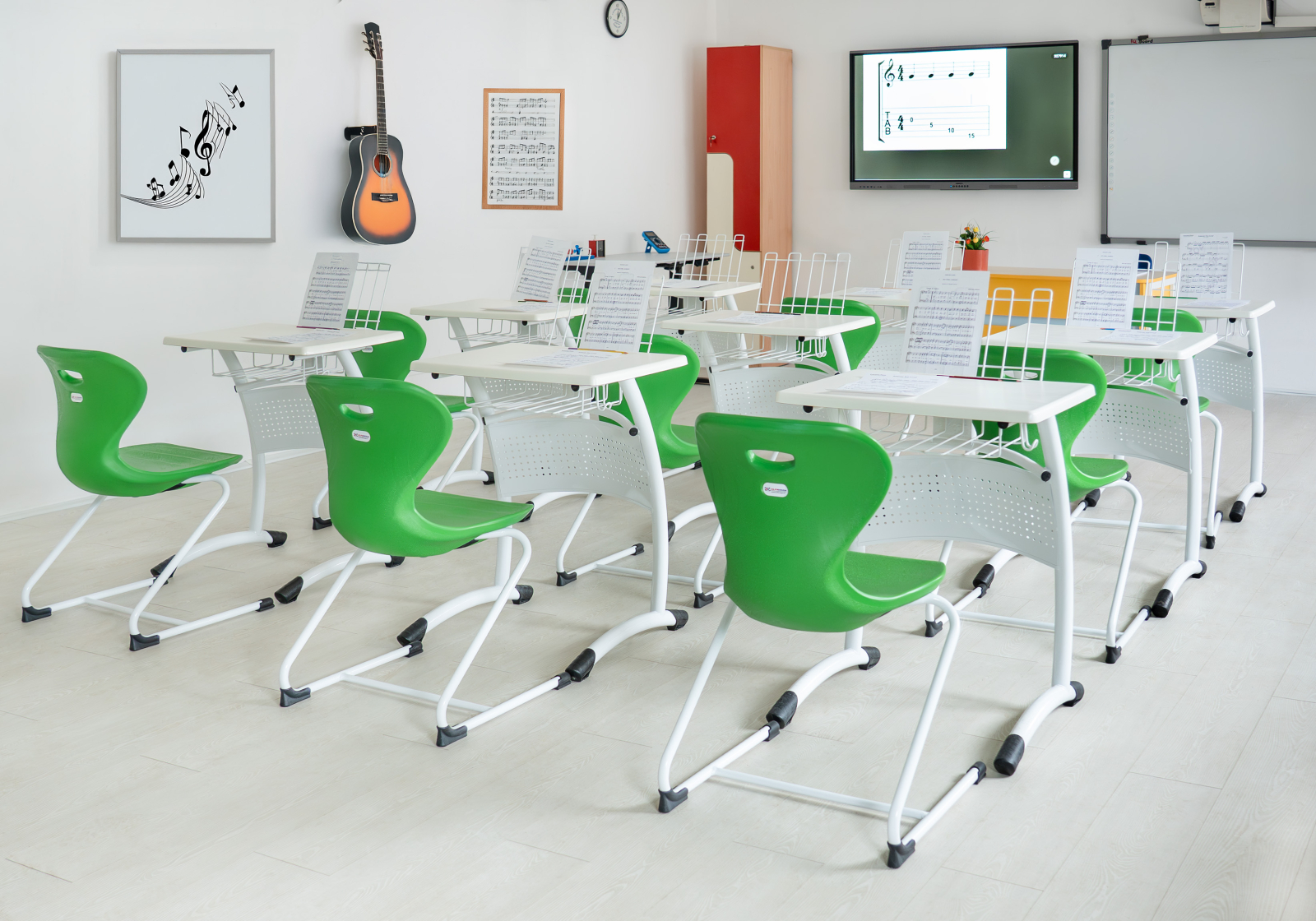- Prevăzut cu suport pentru cărți robust, în structură complet sudată, poziționat sub blat, vopsit în câmp electrostatic și suport de partitură care oferă o platformă stabilă și ajustabilă, permițând poziționarea comodă a partiturilor pentru o experiență optimă în timpul studiului muzical